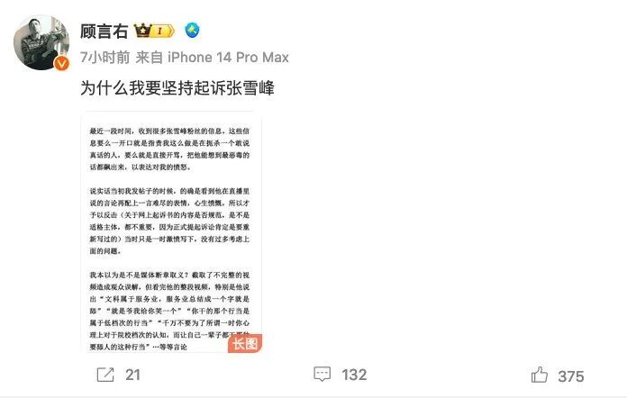 对于张雪峰发布的“致歉”微博,“顾言右”认为,张雪峰是用一种嬉笑怒骂的方式道歉,不是真心道歉。而且张雪峰发表上述言论后,一些相关帖子里有网友评论区留言“文科生在社会大众心目中地位极低,因为不学无术之人众多……”“顾言右”认为,张雪峰的行为是在侮辱文科生,间接助长了社会对于文科生的偏见与攻击,造成对文科生名誉的贬低和羞辱。
