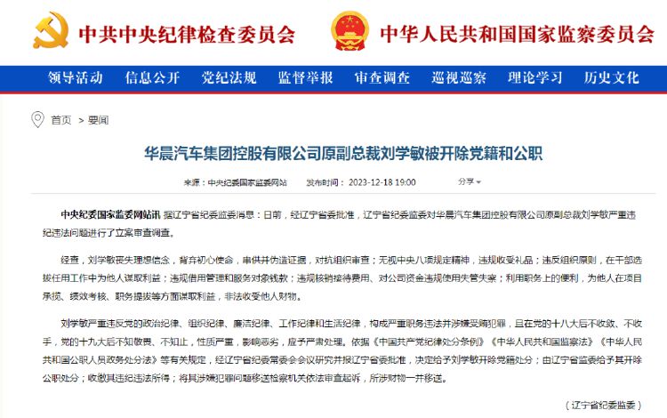 据了解,2023年9月15日,中央纪委国家监委通报,刘学敏涉嫌严重违纪违法,接受辽宁省纪委监委纪律审查和监察调查。