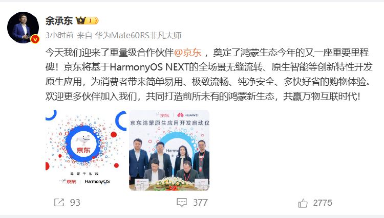 1月10日晚间,华为常务董事、终端业务CEO董事长余承东发布微博官宣:今天迎来了重量级合作伙伴京东,奠定了鸿蒙生态今年的又一座重要里程碑!京东将基于HarmonyOS NEXT的全场景无缝流转、原生智能等创新特性开发原生应用。