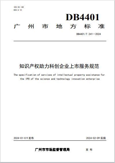 据“广州市场监管”微信公众号1月14日消息,近日,广州市市场监管局(知识产权局)牵头制定的《知识产权助力科创企业上市服务规范》地方标准(以下简称《规范》)正式发布,将于2024年2月9日起实施。