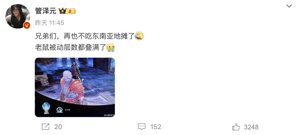 随后管泽元也发文:“兄弟们,再也不吃东南亚地摊了,老鼠被动层数都叠满了。”