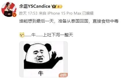 13日,余霜发微博称:“谁能想到最后一天,准备从泰国回国,直接食物中毒......牛......上吐下泻一整天。
