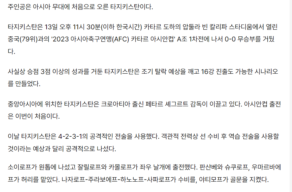 针对本场比赛,韩国媒体STNSPORTS发表了一篇题为《在亚洲杯中首次出场的塔吉克斯坦队(第106名)用20次射门嘲讽中国男足》的文章称,国足被对手完成20脚射门,收获平局已是十分幸运。