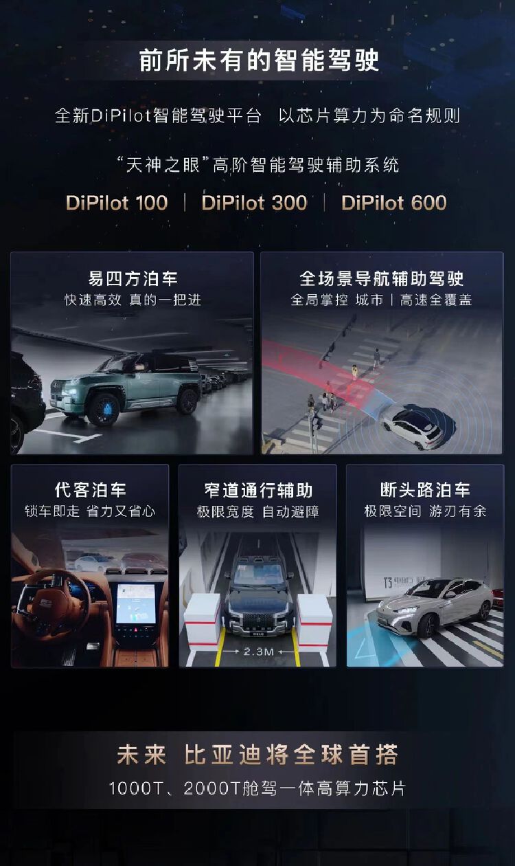 此次发布的全场景导航辅助驾驶,以安全为前提,做到起步、制动更平稳,大曲率弯道更丝滑。同时,还发布了近距离代客泊车,实现车辆在复杂场景下的安全泊入,有图无图,均可代客。未来,比亚迪将不断降低智驾的体验门槛,以更领先的技术、更具竞争力的成本,加速智驾普及。