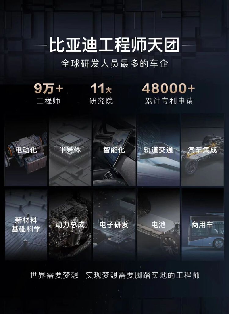 技术领先的背后,是一群有梦想的工程师。发布会上,比亚迪十大工程师天团首次亮相,展现比亚迪脚踏实地的工程师文化。如今,比亚迪拥有9万余名工程师,是全球研发人员最多的汽车企业。