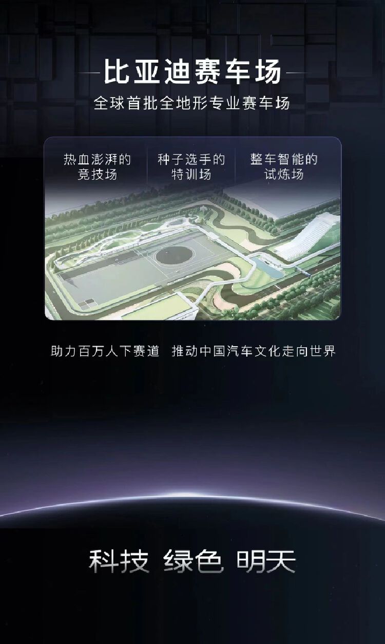 技术让汽车拥有强健的筋骨,文化才能赋予它伟大的灵魂。比亚迪还重磅宣布,投入50亿元建设全球首批全地形专业赛车场,构建新能源时代的汽车文化,推动中国汽车文化蓬勃发展,走向世界。