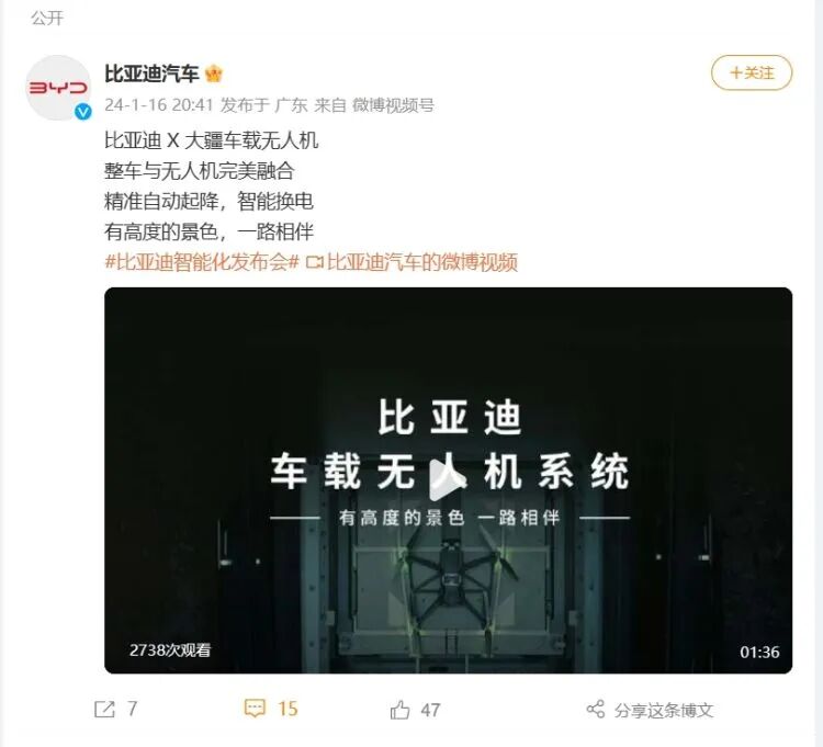 1月16日,2024比亚迪梦想日正式举办。据比亚迪汽车官博1月16日晚间消息,比亚迪与大疆合作发布车载无人机。据视频介绍,该系统具有图像实时回传功能,可在车上即时查看无人机影像。另外,2024比亚迪梦想日重点发布了新能源汽车智能化发展全新战略——整车智能。