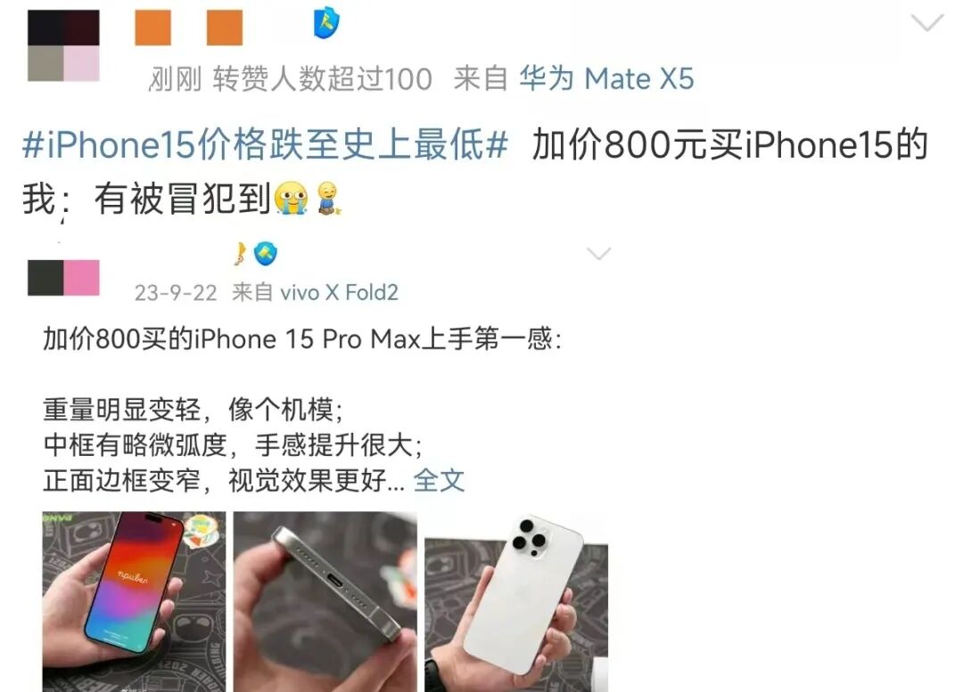 也有网友表示,当初加价买的iPhone 15,现在感觉有被冒犯到。