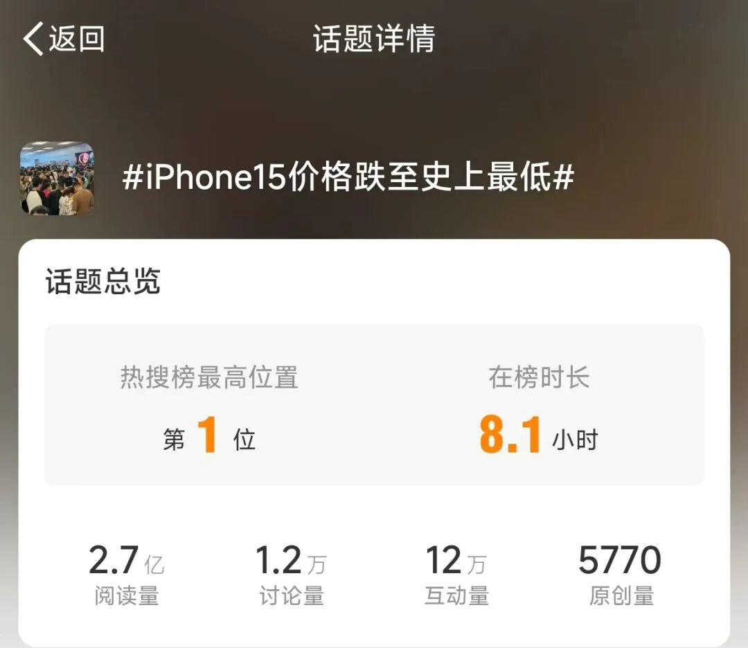距离苹果官网罕见大降价仅两天的时间,1月17日,有关#iPhone15价格跌至史上最低#的相关话题再次冲上热搜。