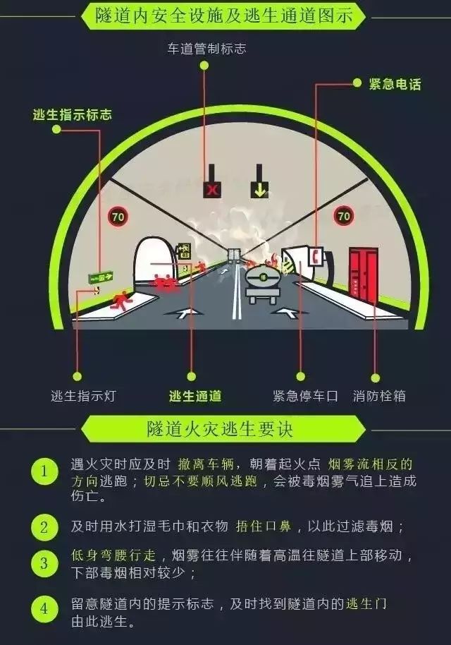 如遇险情不可控时,驾乘人员可以通过观察疏散标志,选择就近通道,自行打开防火门或卷帘逃离至另一侧隧道。穿过隧道后,切记要沿路侧检修道贴墙行走,避开过往车辆。