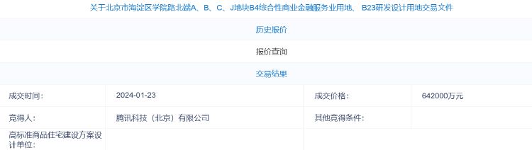 据北京市规划和自然资源委员会官网,腾讯科技(北京)有限公司以64.2亿元的底价竞得北京市海淀区学院路北端A、B、C、J地块B4综合性商业金融服务业用地、B23研发设计用地。