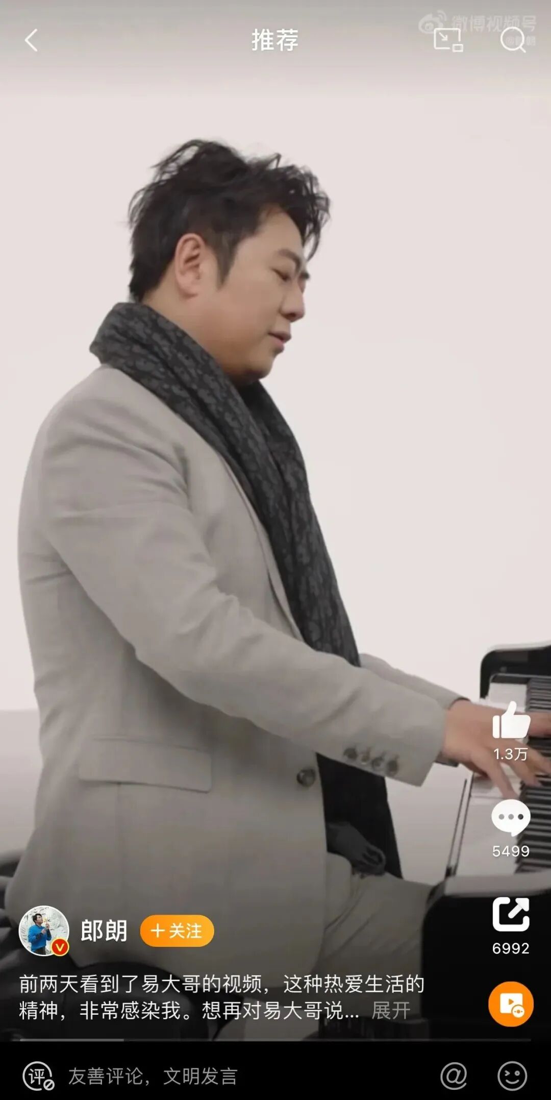 郎朗回应老易这事,还得追溯到老易来参观总台的那一天。在总台大厅弹奏完钢琴之后,老易腼腆地笑着说,如果有机会的话,希望得到郎朗的指导。