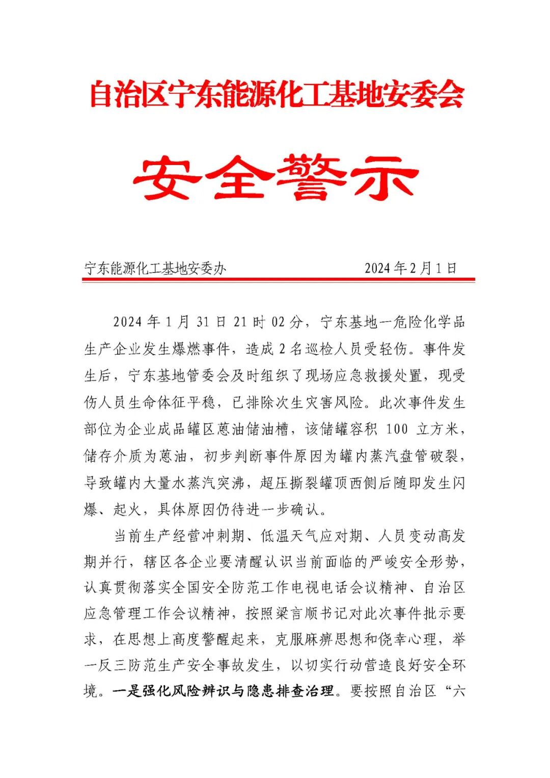 据“宁东应急”微信公众号2月1日消息,1月31日21时02分,宁夏宝丰能源集团股份有限公司精细化工厂发生一起爆燃事故,造成现场临近的2名巡检人员受轻伤。事故发生后,宝丰公司立即启动应急响应,14分钟火情解除,事故得到有效处置,未发生次生灾害。