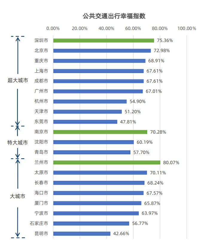 在所研究的50座城市中,2023年,兰州市、深圳市、北京市等10个城市的指数较高,说明其公共交通(地面公交+地铁)运行效率、可靠性,相对其他城市公共交通运行水平的综合表现较好。其中,深圳市、北京市、重庆市分别位居超大城市“出行幸福指数”首位,而南京市和海口市的“出行幸福指数”列特大城市和大城市首位。