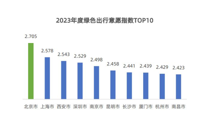 《报告》透露,基于全国50个主要城市的公交&地铁、骑行和步行路线规划占总规划次数的比例,规范化后得出各城市的“绿色出行意愿指数”。2023年度,绿色出行意愿最强的城市为北京市,其次为上海市、西安市、深圳市。