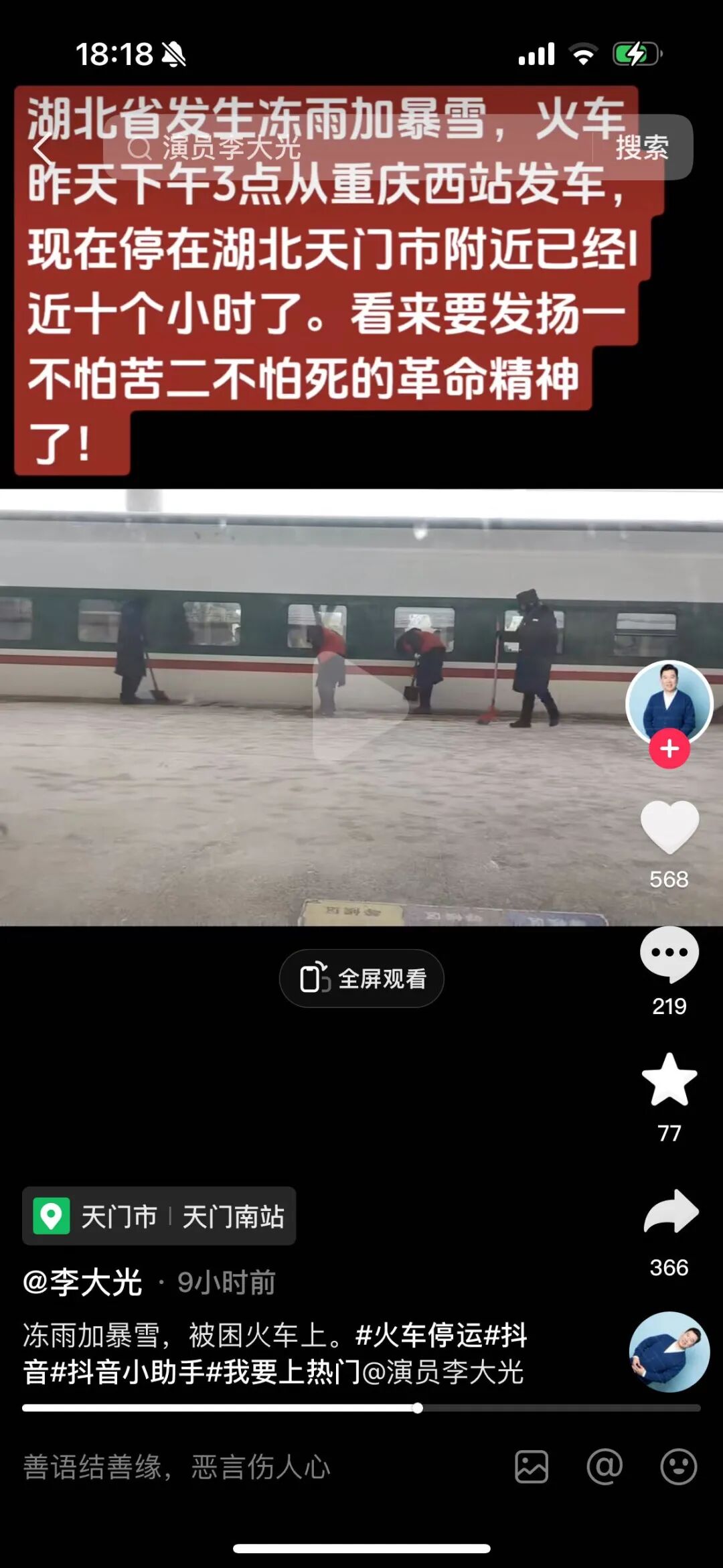 演员李大光在社交平台发布信息称自己乘坐的列车在天门附近已经停了近十个小时(抖音视频截图)