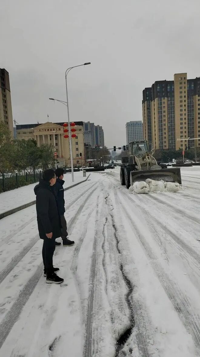 2月3日上午,天门市住建局全系统100余名干部职工全员上路,网格化清理主次干道、城市桥梁积雪。(图源:天门市融媒体中心)