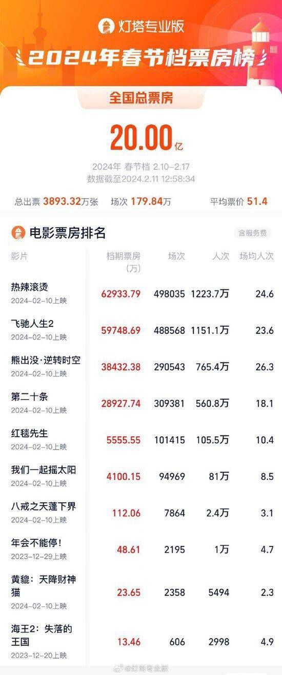 据灯塔专业版数据,截至2月11日12时58分,2024年春节档(2月10日—2月17日)档期总票房(含预售)突破20亿元。