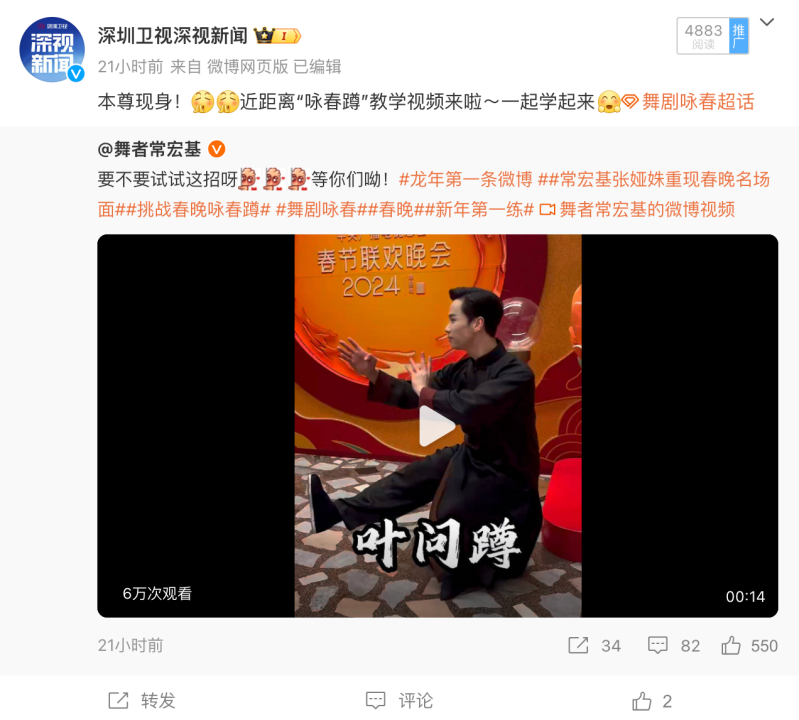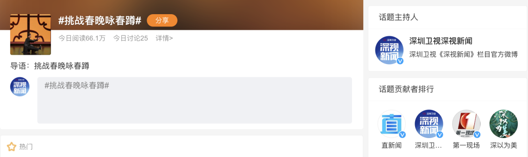 在新浪微博,拍好视频并将视频上传后,编辑文案带上#挑战春晚咏春蹲#的话题,即可参与挑战。