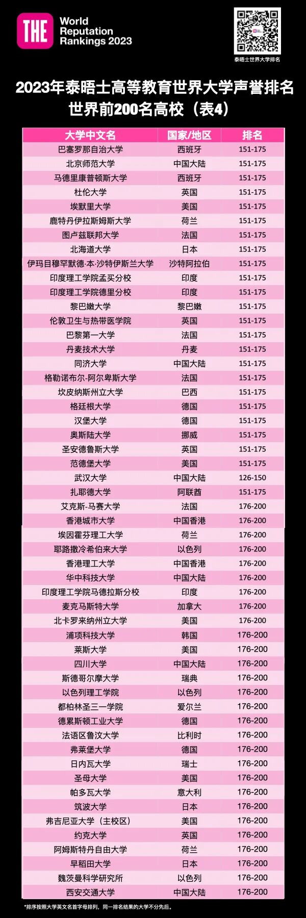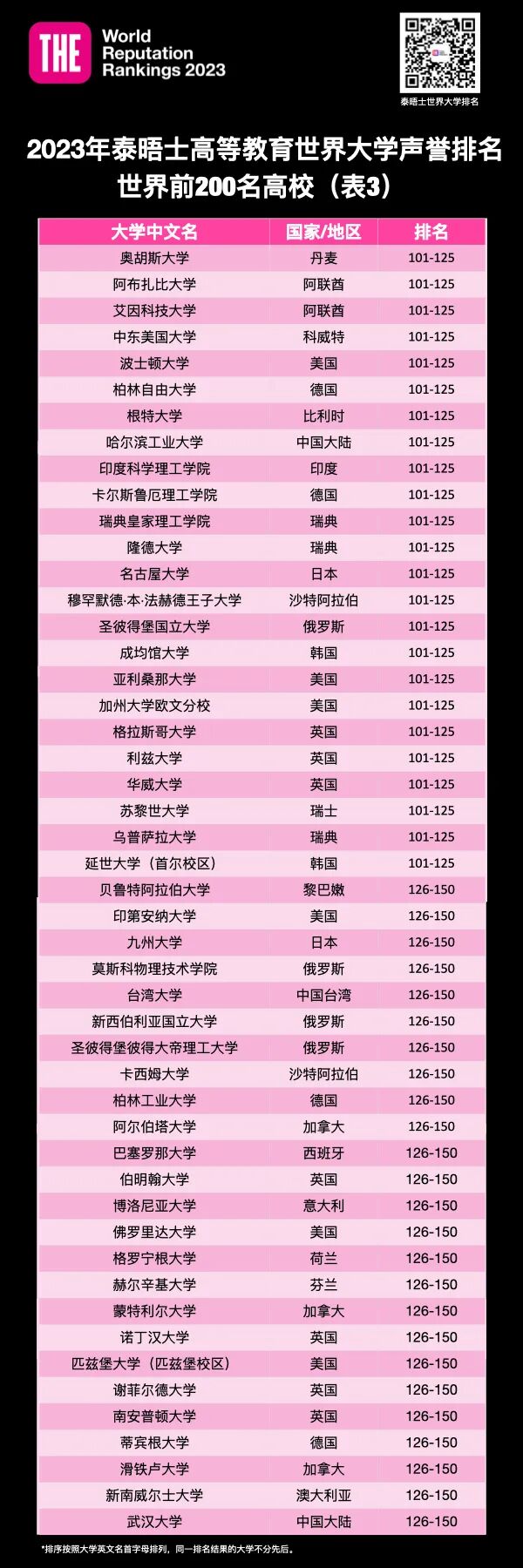 据介绍,泰晤士高等教育世界大学声誉排名结果,是通过全球最大规模之一的邀请制学术问卷调查评选而出,根据那些发表过论文的资深学者(对大学卓越性最了解的人)的评判,提供了全球最强大的200所大学品牌的最终名单。