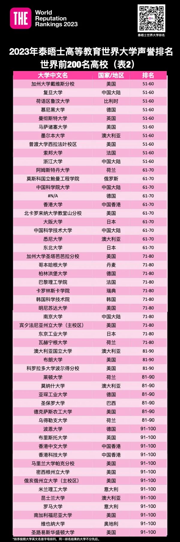 截图自2023年度泰晤士高等教育世界大学声誉排名表单。