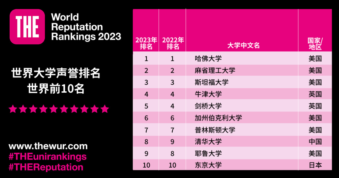 根据2023年度泰晤士高等教育世界大学声誉排名,哈佛大学连续第13年蝉联榜首,麻省理工学院连续第八年稳居第二位。斯坦福大学连续第二年排名第三。