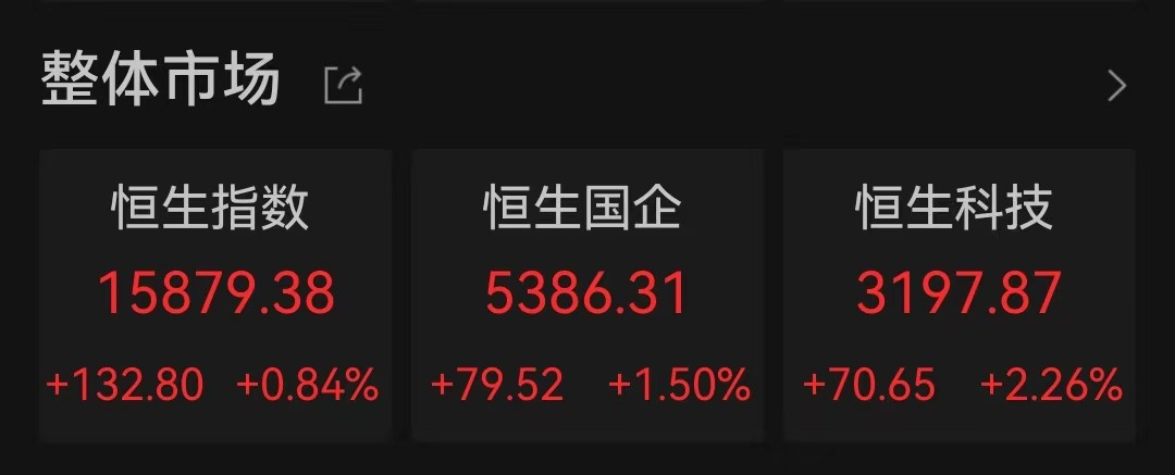 Wind数据显示,今日在集体低开后,港股三大主要股指于盘中持续拉升,午间收盘前集体转涨,午后恒生科技指数涨幅持续扩大。截至收盘,恒生指数涨0.84%,报15879.38点;恒生中国企业指数涨1.50%,报5386.31点;恒生科技指数表现更强,全天上涨2.26%,报3197.87点。