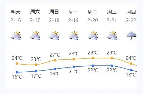 深圳天气预计16-17日(初七-初八)大致多云,早晚有轻雾,16日气温16-24℃;18-21日多云为主,增温增湿,早晚有轻雾或雾,间中有分散小雨。如遇雨雾天气,驾车时务必“降速、控距、亮尾”,仔细观察路面情况。