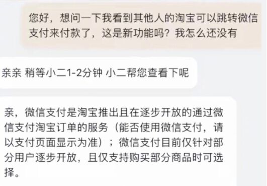 对于该情况,淘宝客服表示,微信支付功能现在是在测试中,目前仅针对部分用户逐步开放,且仅支持购买部分商品时可选择。淘宝后续将逐步全部进行覆盖,而且“这个时间不会太长”。