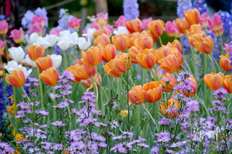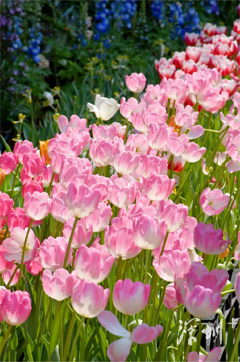 众多球根花中,郁金香人气最旺。梦幻的粉白花朵,在风中闪耀出珠光,营造出童话般的意境。最出彩的橙黄色花朵,不论与谁合影,都能成功“抢镜”。