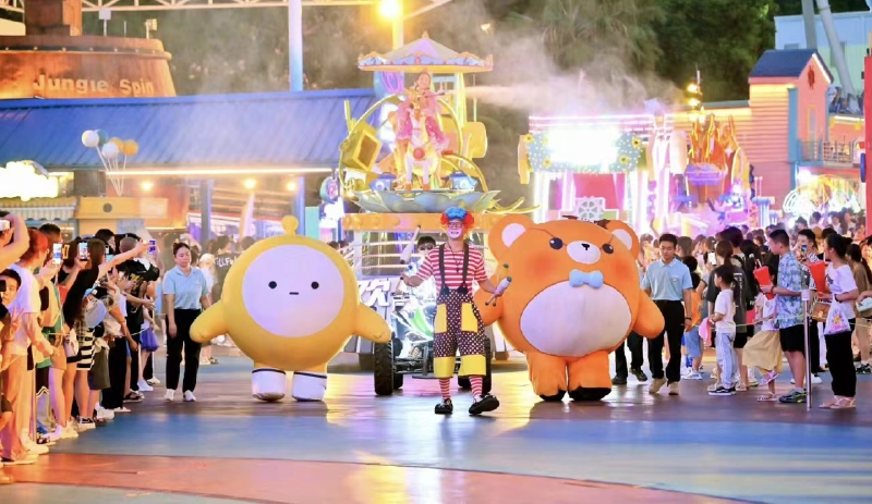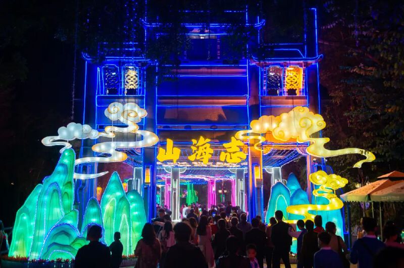 海上田园的“国潮光影不夜城”灯光秀打造十三大景点,灯展涵盖景区主干道、田园广场等区域,每天晚上都会在景区望海楼前水域开展水上演出。
