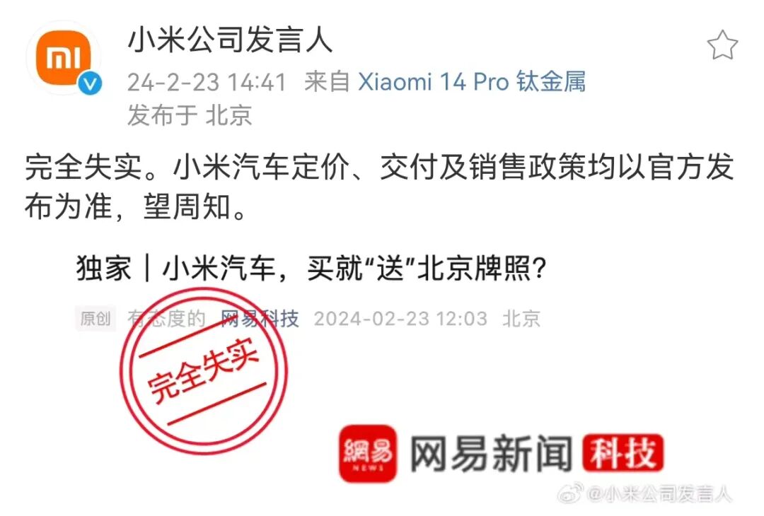 针对网络上“买小米汽车,送北京车牌”的消息,小米方面2月23日回应称,完全失实。