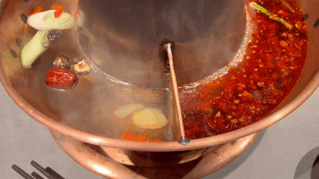 这种火锅的特色在于它的简单与纯粹。“铜锅一盏、清水一碗、姜葱两三”,简简单单十二字道尽汤底的奥秘。