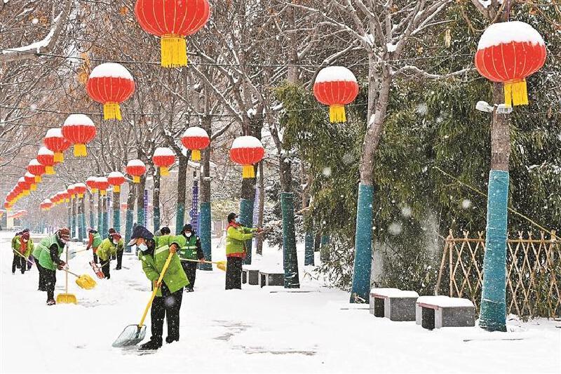 ▲2月21日,河北石家庄园林工人在清理积雪。新华社发