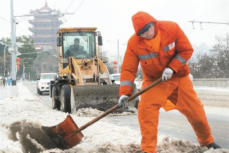 ▲2月22日,环卫工人在武汉长江大桥清扫积雪。新华社发
