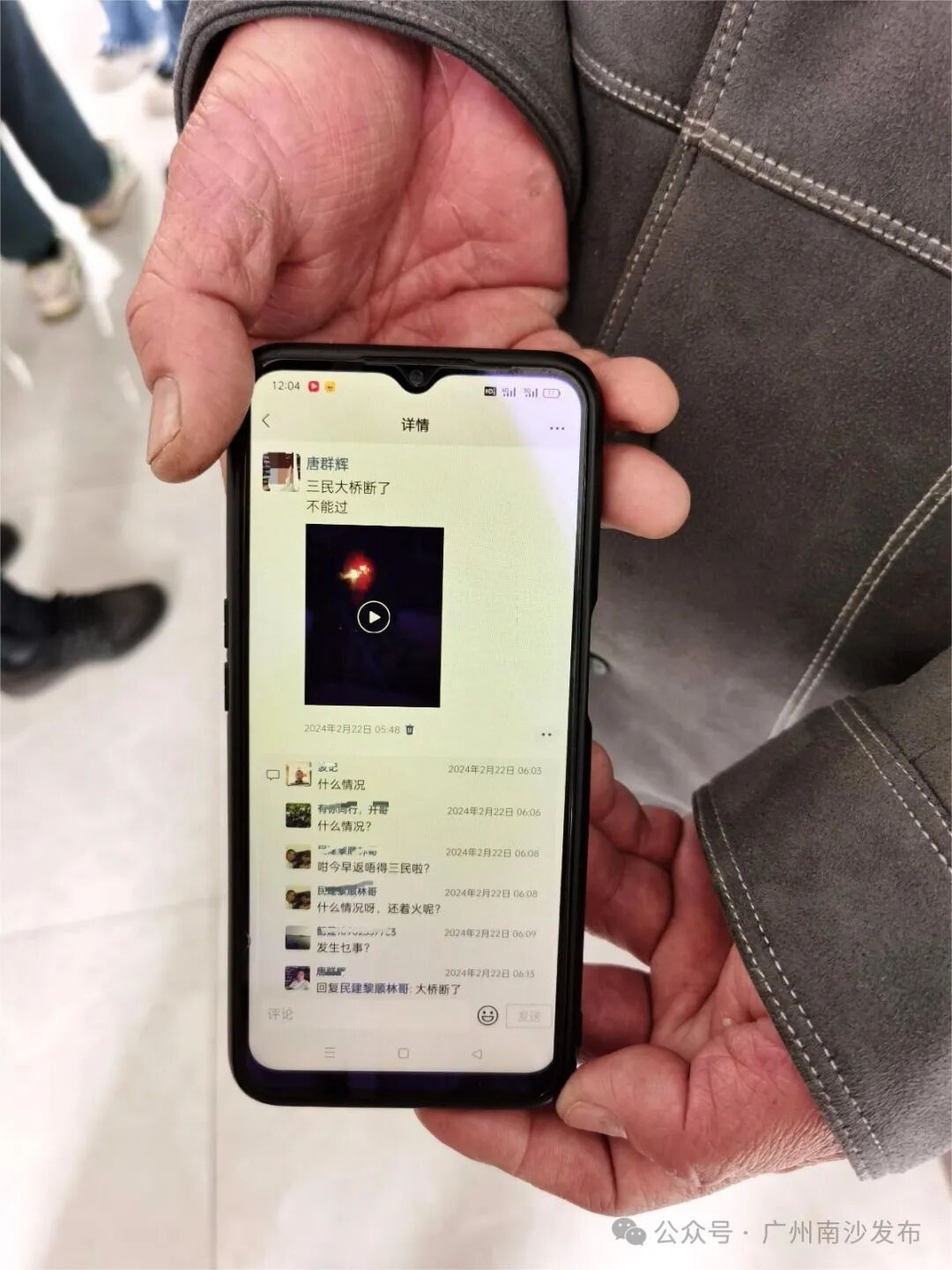 在当天5点48分左右,唐群辉还把现场录制的视频转发到自己的朋友圈,并配上“三民大桥断了,不能过。”的文案。“我是做农资店的,想着第一时间把桥断的视频发了出去,很多起得早的朋友、农户和客户都会看到,可以提醒他们不要上桥。”