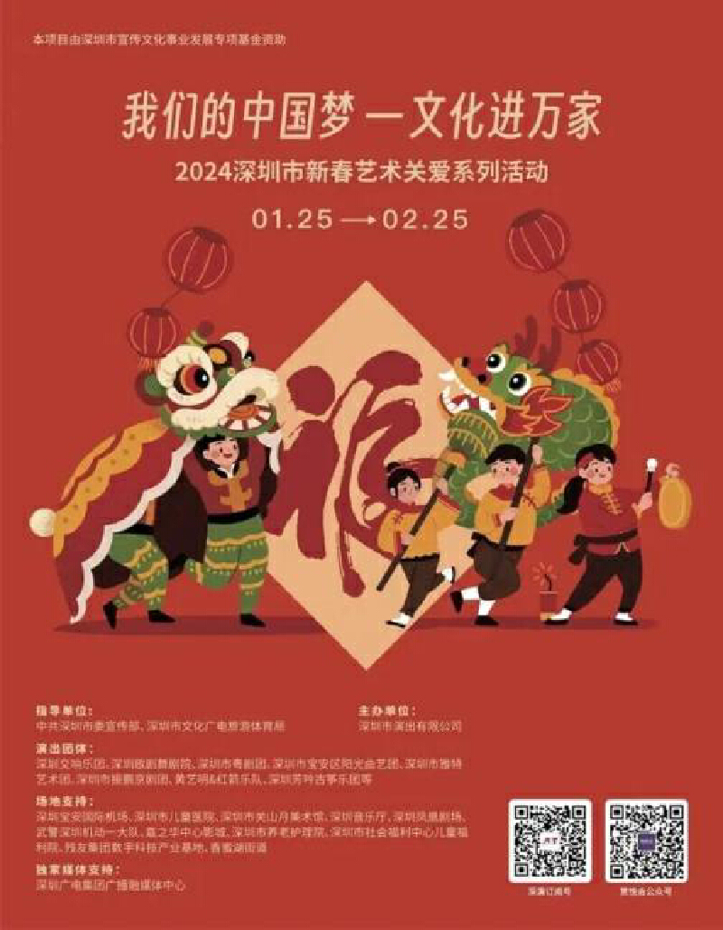“深圳市新春艺术关爱系列活动”由中共深圳市委宣传部、深圳市文化广电旅游体育局指导,深圳市演出有限公司主办。自2008年创办以来,该活动已成功举办15届,丰富城市文化生活的同时,打造浓浓年味和喜庆欢乐的节日氛围。
