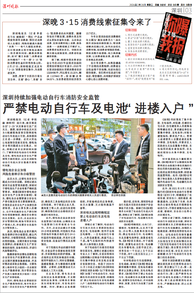 据了解,深圳晚报已连续多年在“3·15”前夕推出消费线索征集令,面向社会征集报料线索,推动一批“疑难杂症”的消费问题得到有效解决。今年,“3·15”监督报道还将深入开展,聚焦关键行业、关注重点领域,着力推动解决与市民息息相关的消费问题,提升深圳消费环境水平。
