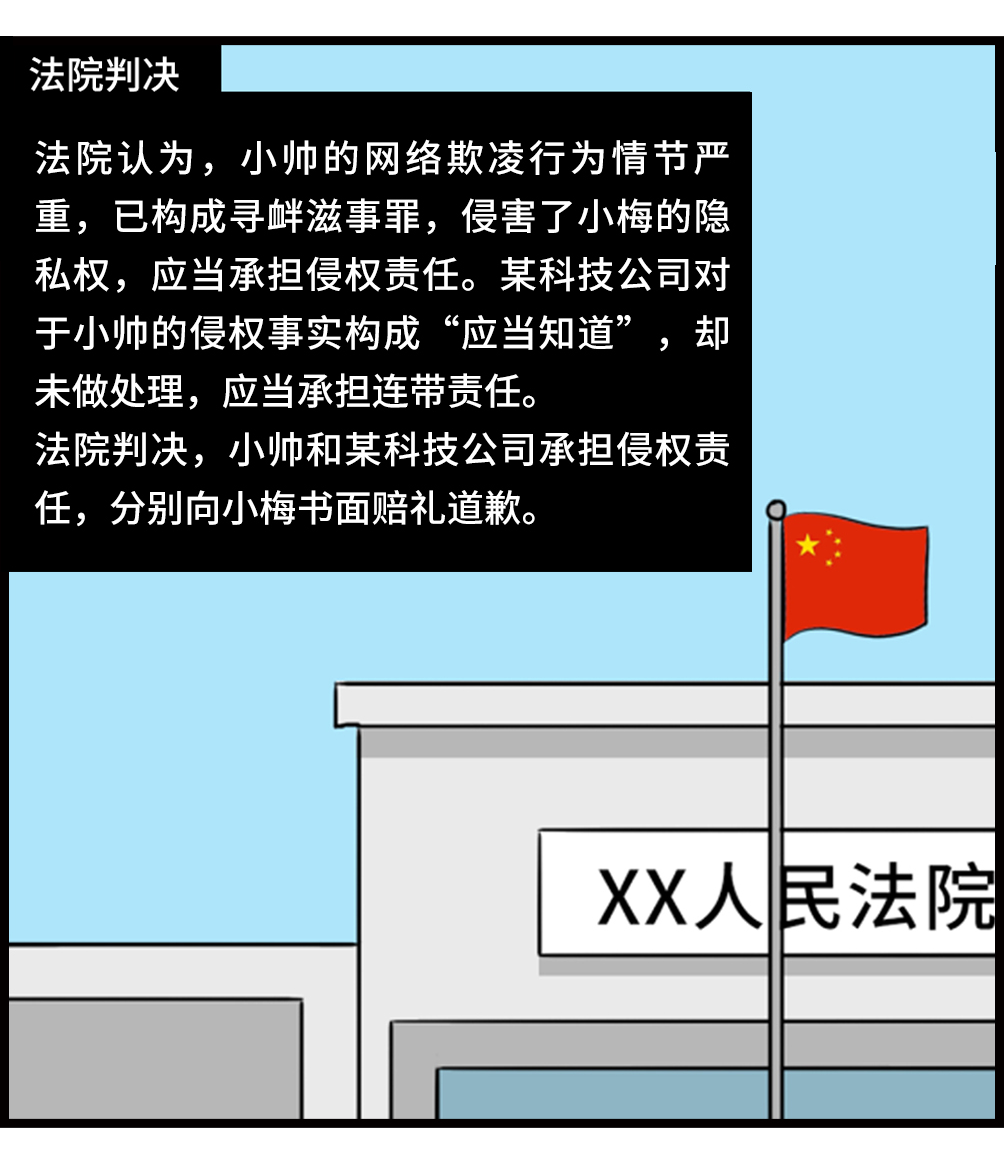 漫画案例中,小梅曾经的网恋男友小帅将她的裸照及视频发布网络平台,并威胁她继续与其恋爱。幸运的是,小梅和母亲及时报警处理,勇敢地拿起法律武器保护自己,经法院审理,小帅因犯寻衅滋事罪被判处有期徒刑一年三个月。但是,小梅的照片和视频仍然以“仅自己可见”的形式留存于小帅的账号后台,平台也拒绝删除。