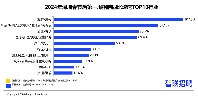 深圳因繁忙的生活节奏,被网民称为不需娱乐只需挣钱的“打工人之城”,但受春节前夕兴起的全国消费出行现象影响,深圳文旅相关行业招聘需求增速明显,超全国平均水平。深圳的旅游/度假职位数同比增长107.8%,排名第一。礼品/玩具/工艺美术/收藏品/奢侈品职位数同比增长87.1%,排名第二。酒店/餐饮职位数同比增长70.7%,排名第三。