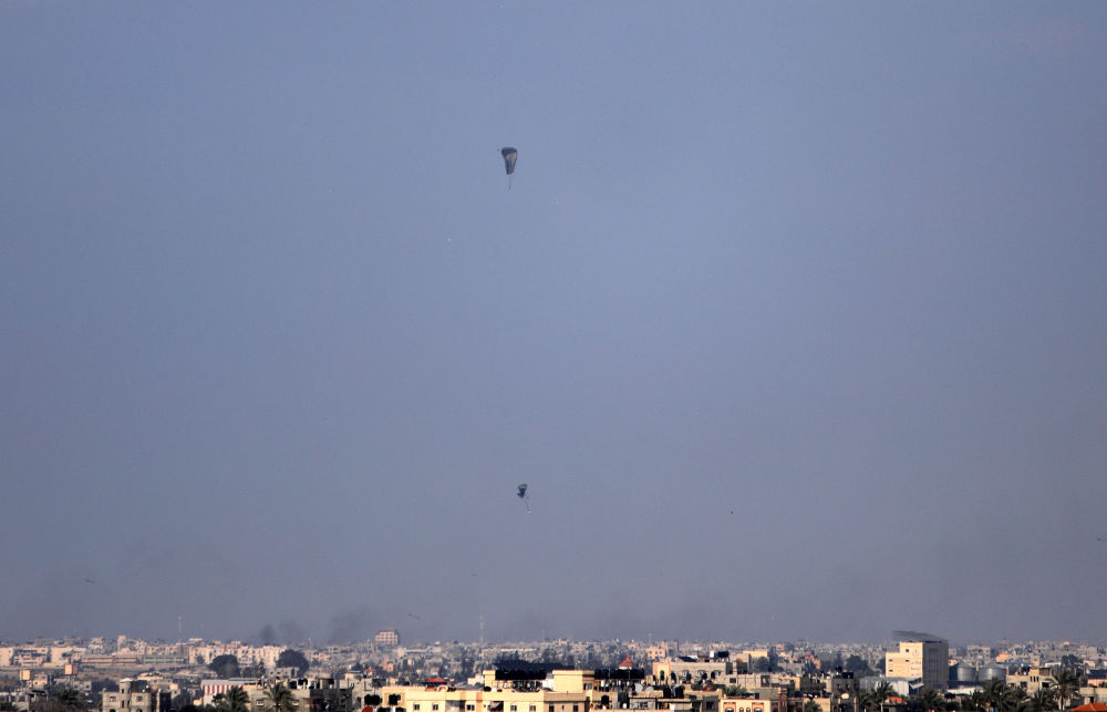 这是2月27日拍摄的向加沙地带空投的救援物资。新华社发(亚西尔·库迪摄)