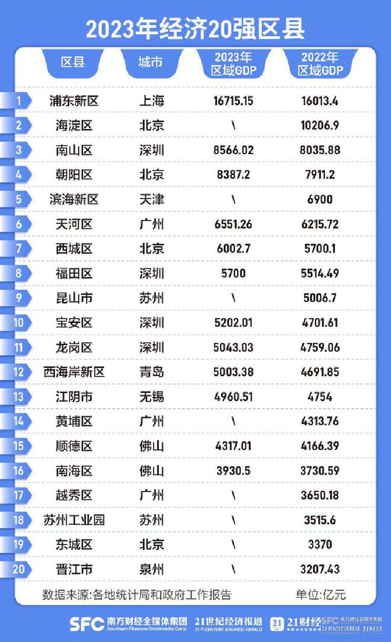 公开数据显示,2023年全国有12个区县实现GDP超5000亿元,包括10个行政区、2个县级市,深圳占了4个席位,占比三分之一。
