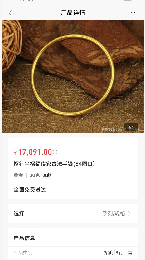 对比来看,银行的金饰售价对比线下金店确实存在一定优势,且在品类上,也不逊色。比如,在招商银行的App上,一款招行金招福传家古法手镯重30克,3月4日每件标价17091元,均价为569.70元/克。