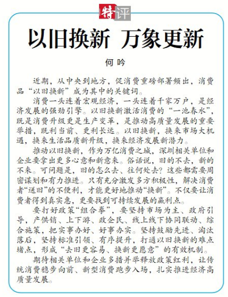 推动以旧换新,作为万亿消费之城,深圳相关单位和企业要拿出更多心意和新意来。俗话说,旧的不去,新的不来。可问题是,旧的怎么去、往何处去?这些都需要周密谋划和有力推进。只有充分激发多方积极性,解决消费者“送旧”的不便利,才能更好地推动“换新”。不仅要让消费者得到真实惠,更要找到可持续发展的赢利点。