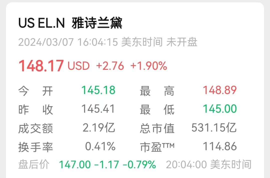截至美东时间3月7日收盘,雅诗兰黛报148.17美元/股,涨1.90%,总市值531.15亿美元。