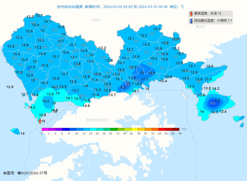 不仅太阳持续“休假”,在降雨的影响下,深圳全市气温普遍偏低,天气持续阴凉,3月9日夜间至3月10日白天,全市最低气温普遍在13-14℃,北部地区再低1℃左右。
