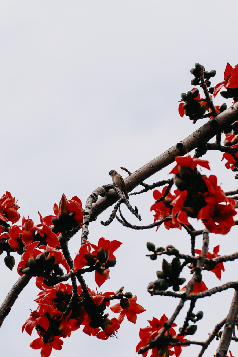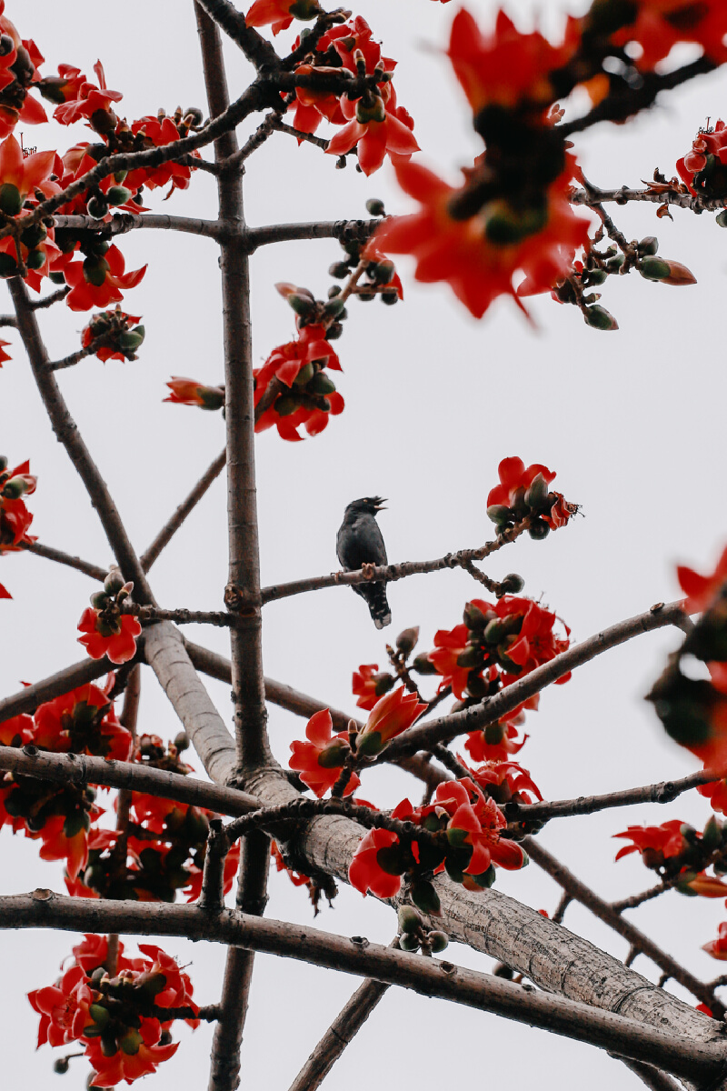 若仔细凝视,会发现花枝上跳跃着无数小黑点,那红彤彤的木棉花仿佛是自然界的磁石,吸引着鸟儿们纷纷前来共享“闹春”盛宴。这些小鸟或在枝头轻轻吟唱,或在花间欢快地舞动,展示着大自然最真挚的语言。