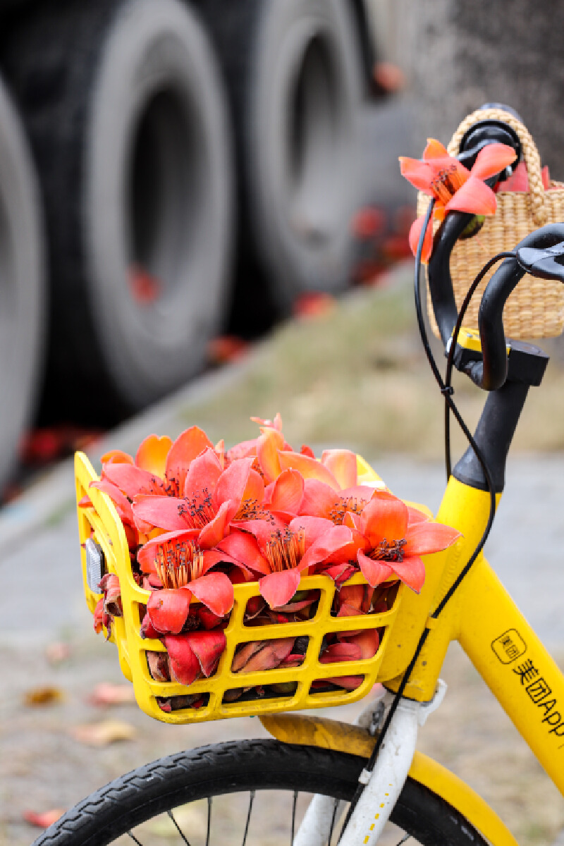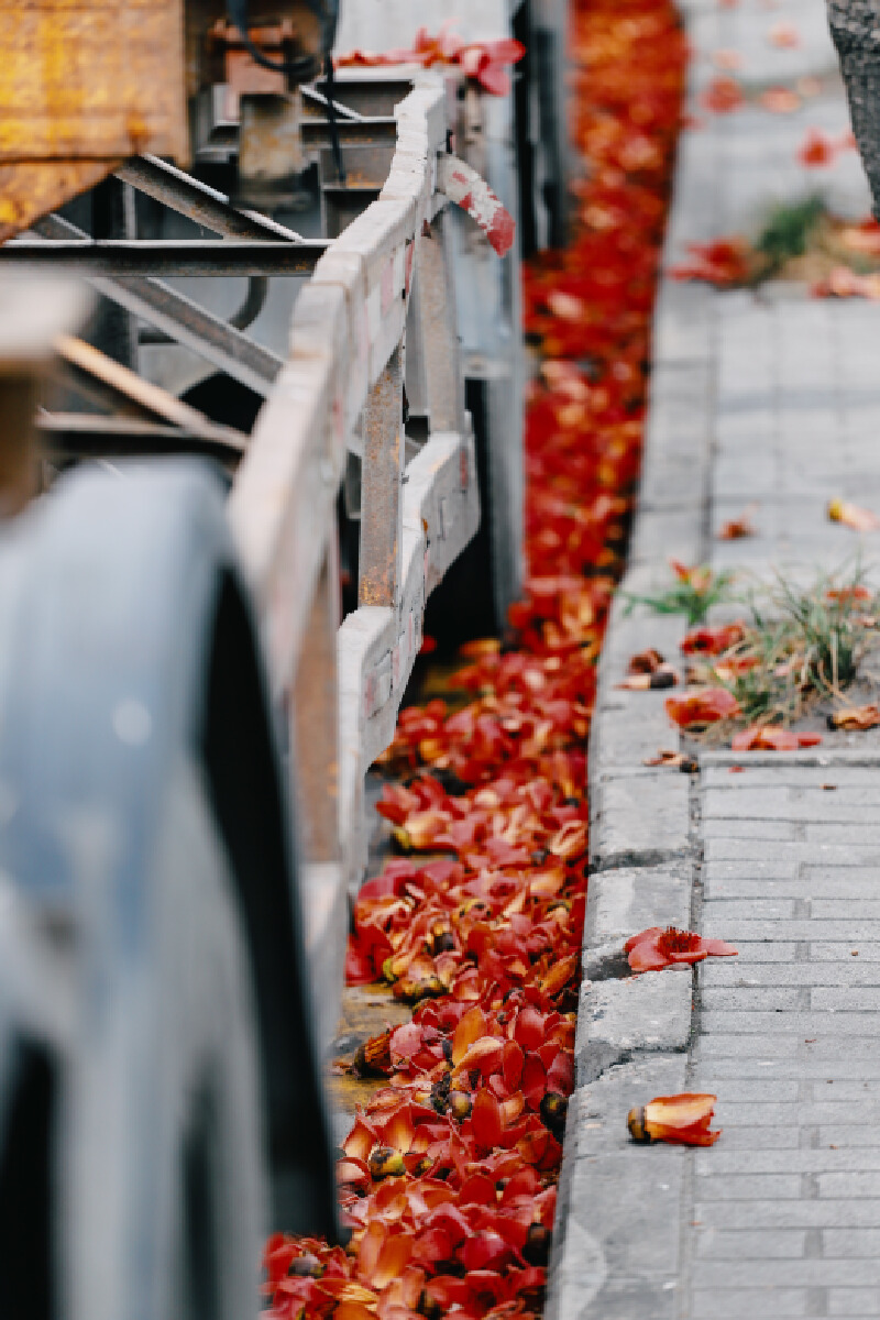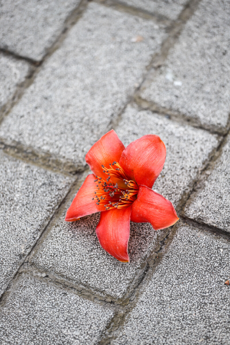 当花期到来,树下便成了落英缤纷的海洋,那些花朵在绽放的瞬间永不褪色,而花期一旦结束,便落入尘土,在红棉树下,那落红铺成了一条条花路。