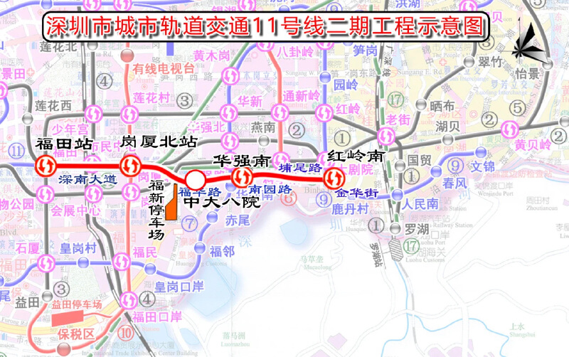 深圳地铁11号线二期工程起于岗厦北站(不含),主要沿深南大道—福华路—南园路—埔尾路—金华街敷设,止于红岭南站,线路全长约4.39公里。共设3座车站:中大八院站、华强南站、红岭南站,另含11号线机场北停车场改扩建工程。深圳地铁11号线二期工程在红岭南站与1、9号线换乘,华强南站与7号线换乘,岗厦北站(不含)与14号线换乘。