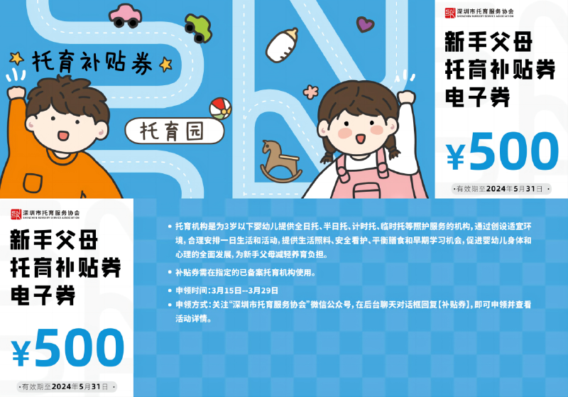 据了解,此次活动面向深圳0-3岁孩子家庭,每个孩子可申领一张500元托育补贴券,可在指定的托育机构使用,补贴券使用时间为3月15日至5月31日。市民可关注“深圳市托育服务协会”微信公众号,在后台聊天对话框回复【补贴券】查看活动详情并申领补贴券。